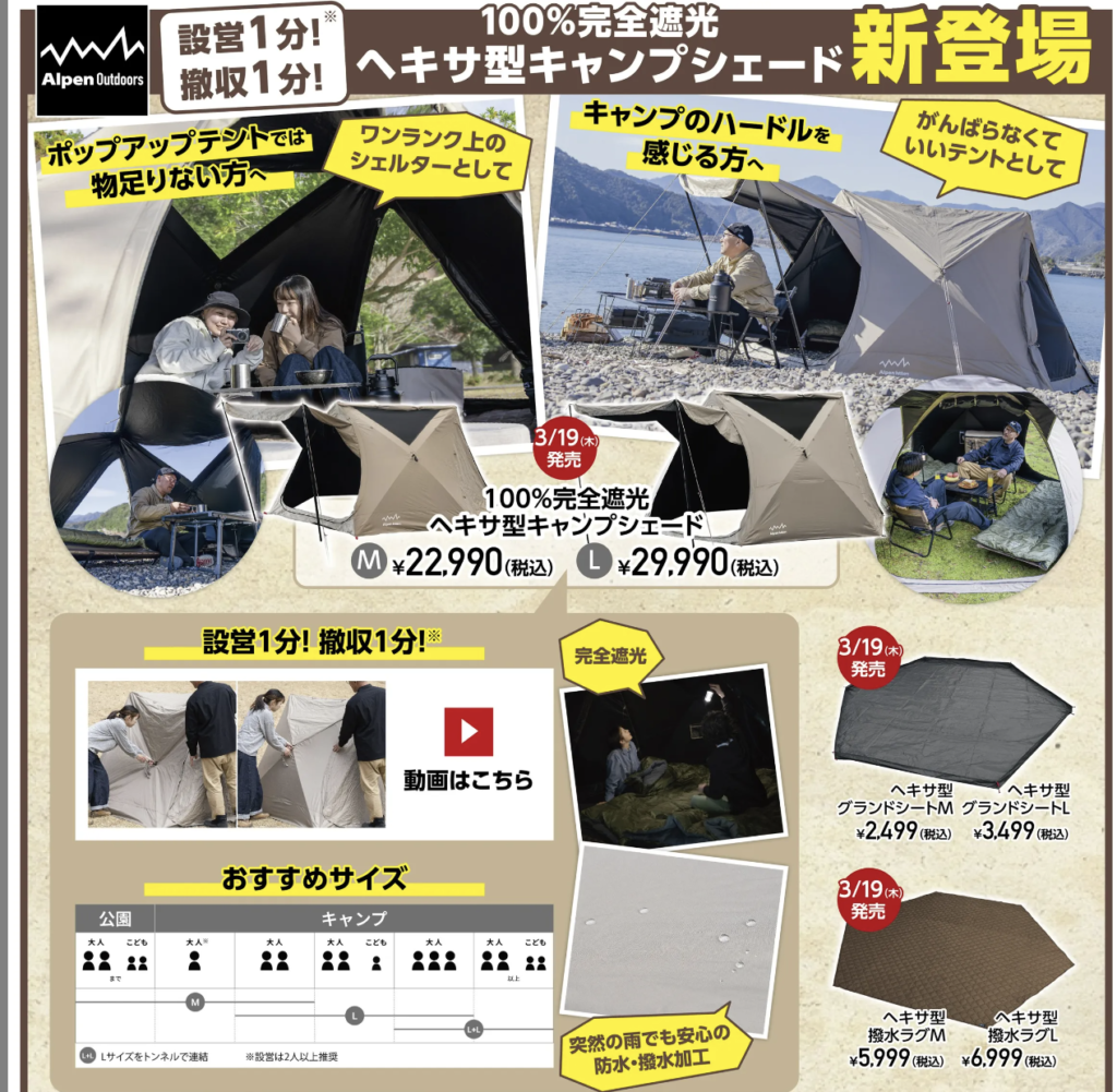 👇 アルペン ヘキサ型キャンプシェード Lの情報はこちら 楽天で見る