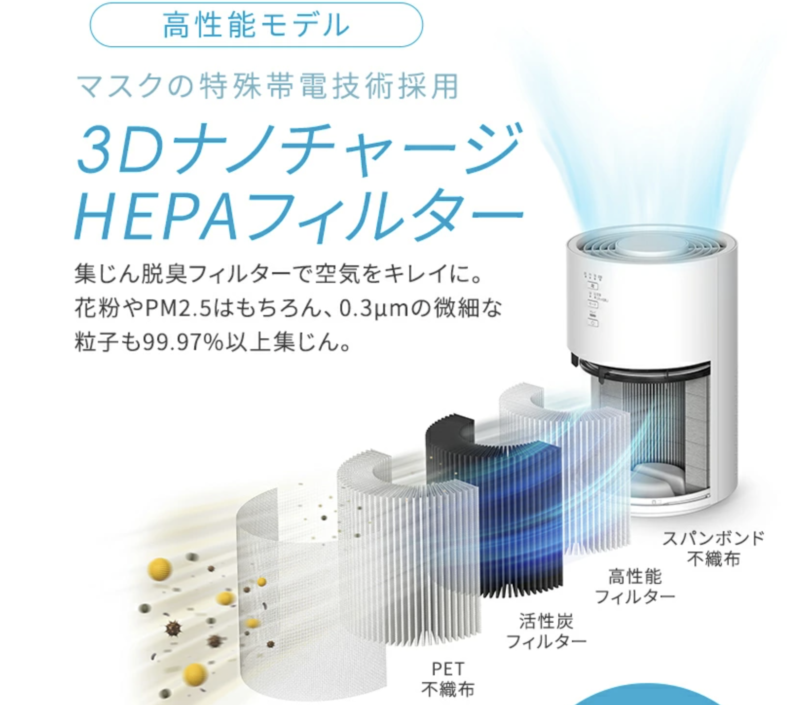 花粉対策にはHEPAフィルター(0.3マイクロメートル以上の粒子を99.97%以上捕集できるフィルター)の搭載が必須です。安価なモデルの中にはHEPAフィルター非搭載のものもあるので、購入前に必ず確認してください。